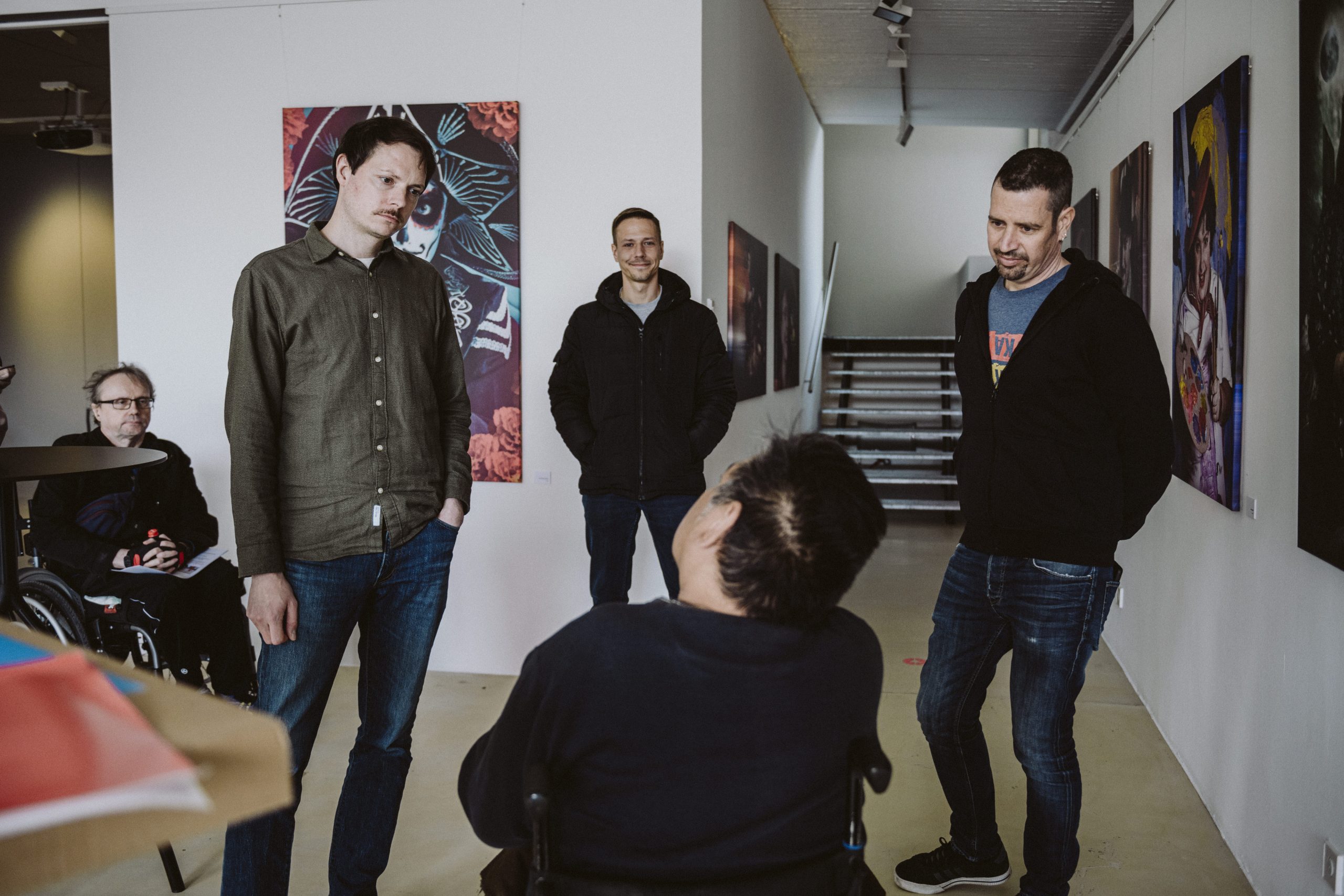 Um diese Haltung auch in der Vermittlung konsequent weiterzuführen, wurden die Bewohnerinnen bereits vor der Ausstellung gezielt auf ihre Rolle vorbereitet. In mehreren Schulungseinheiten vermittelten die Künstler Inhalte zu Bildsprache, Entstehungsprozess und künstlerischer Intention der Arbeiten. Gleichzeitig wurden die Teilnehmenden darin bestärkt, ihre eigenen Perspektiven, Erfahrungen und Deutungen einzubringen. Ziel der Schulung war es nicht, vorgefertigte Texte auswendig zu lernen, sondern Sicherheit im freien Erzählen und im Dialog mit den Besucherinnen zu gewinnen.