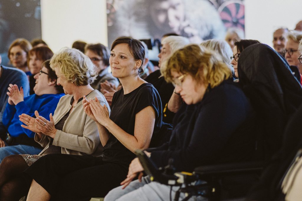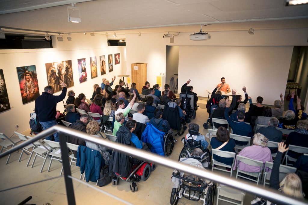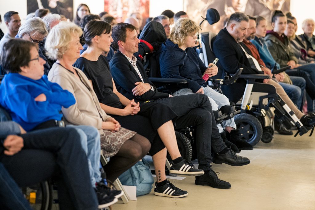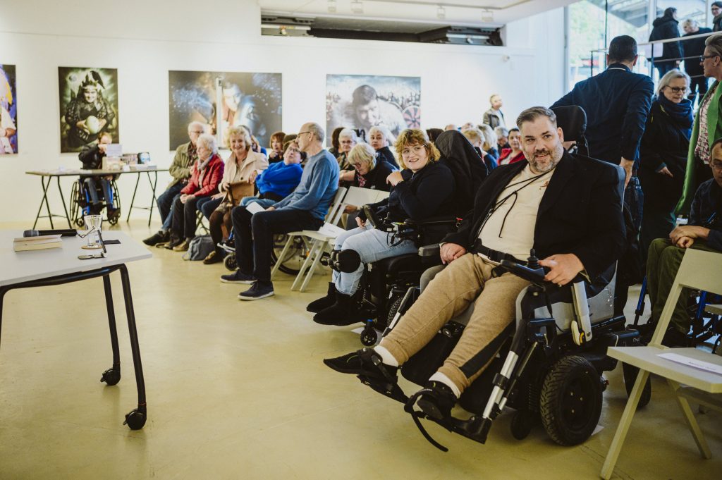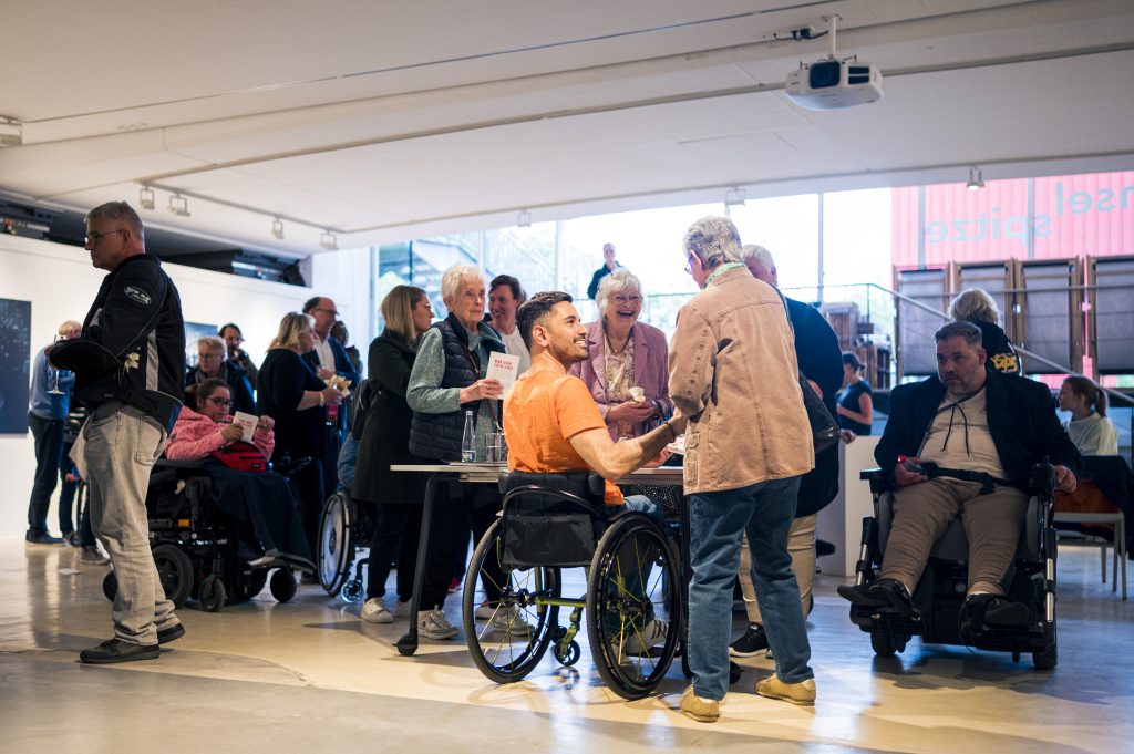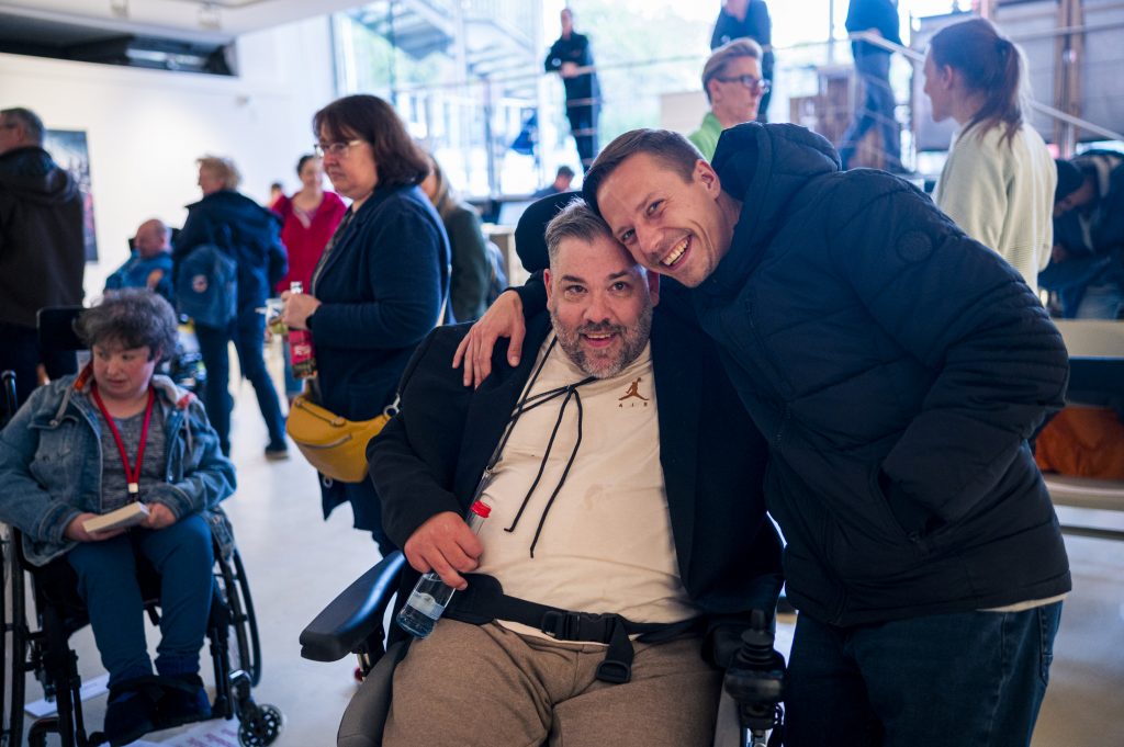 Die Lesung fügte sich inhaltlich und atmosphärisch nahtlos in die Ausstellung ein: Wie die Fotografien und der Film rückte auch Tan Caglar den Menschen in den Mittelpunkt – nicht die Einschränkung. Seine Texte schwankten zwischen pointierten Alltagsbeobachtungen, gesellschaftlicher Reflexion und persönlichen Momenten, die zum Lachen ebenso einluden wie zum Nachdenken. Dabei gelang es ihm, Berührungsängste abzubauen und einen direkten, ehrlichen Zugang zum Thema Behinderung und Selbstbestimmung zu eröffnen.