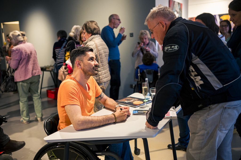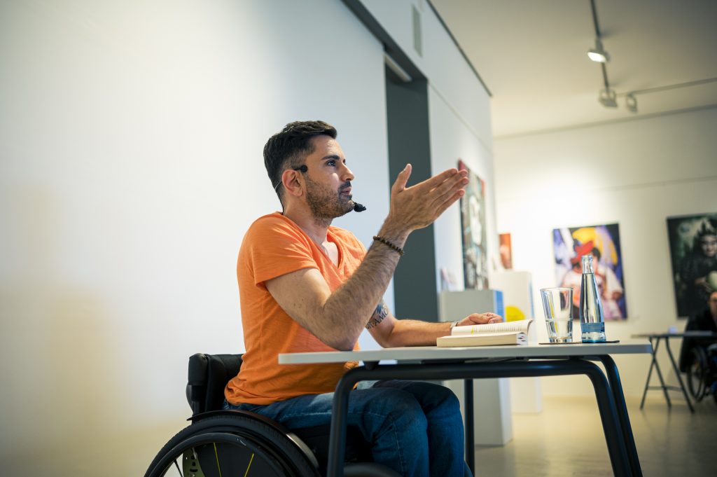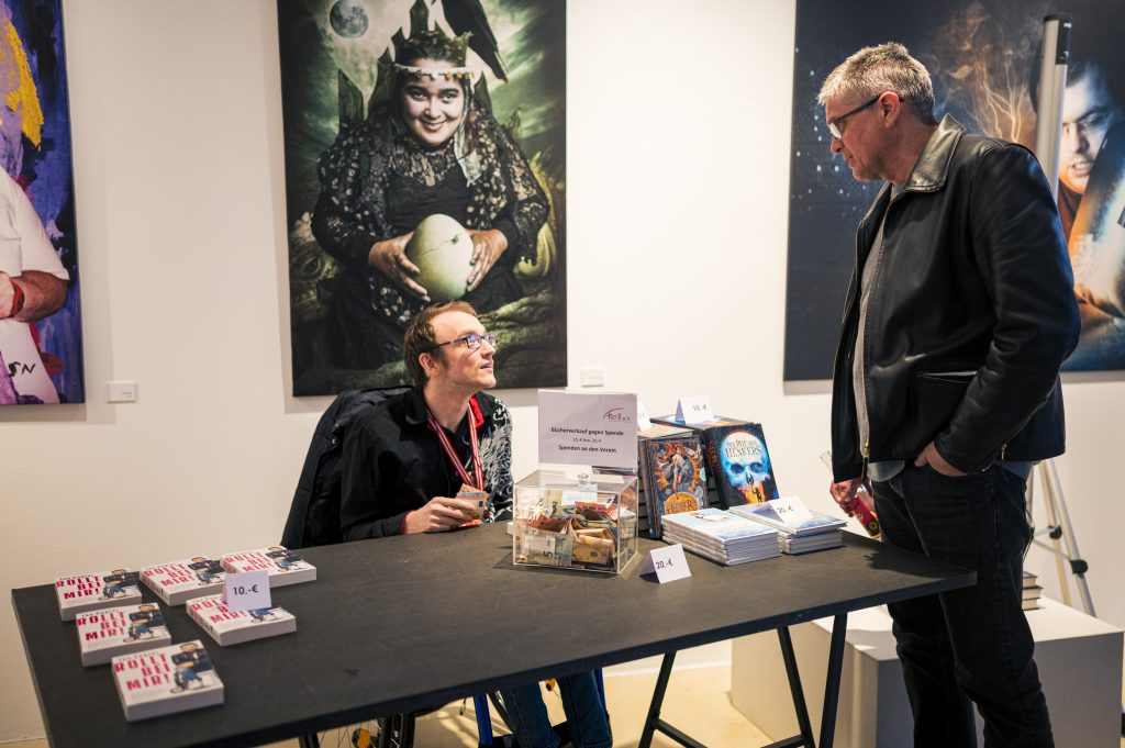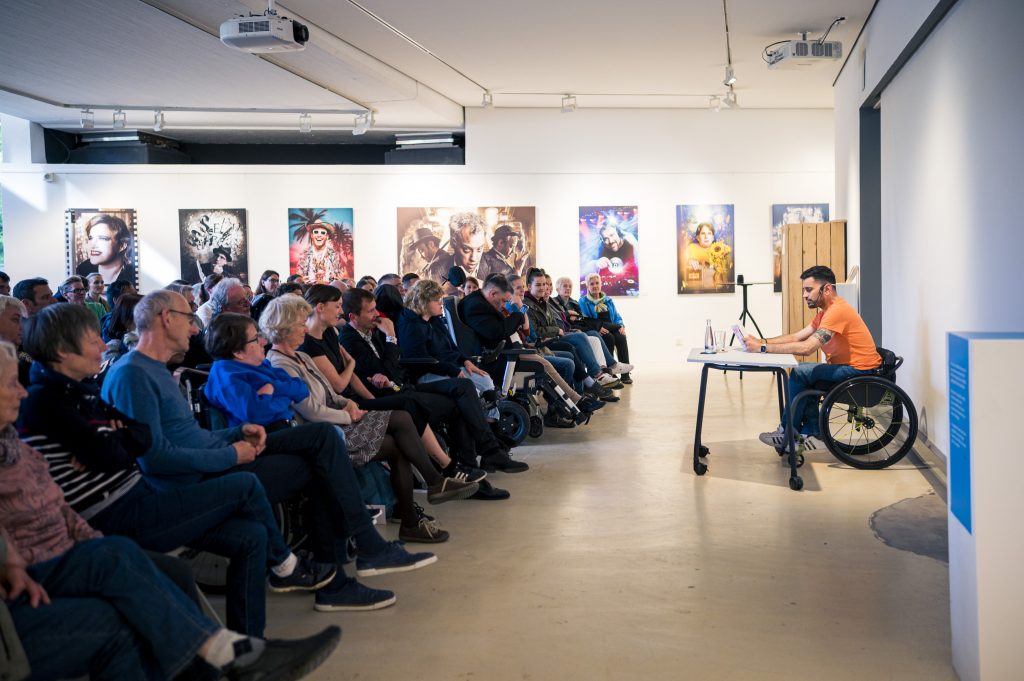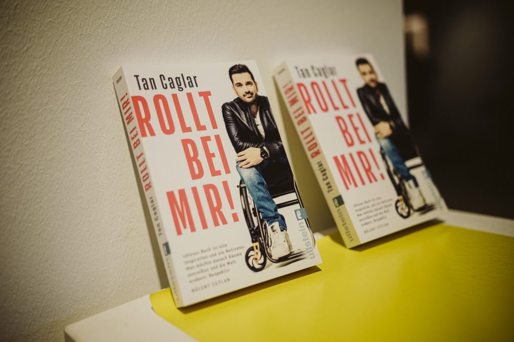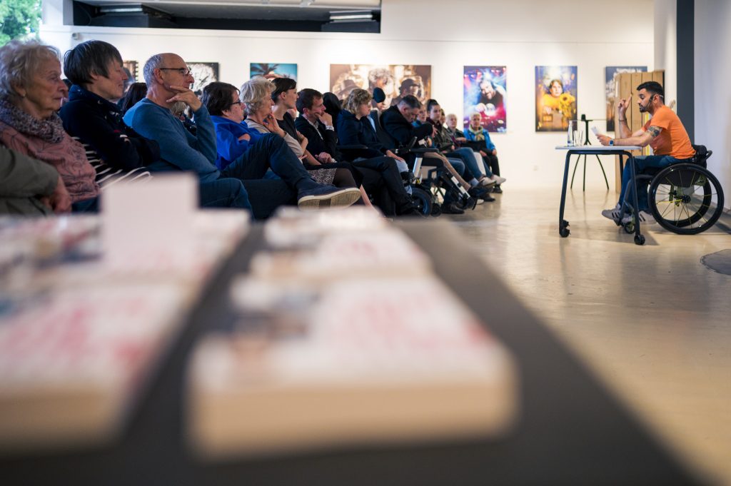 Ein besonderer Höhepunkt im Rahmen der Ausstellung war die Lesung des Comedians, Schauspielers und Autors Tan Caglar aus seinem Buch Rollt bei mir. Mit großer Offenheit, feinem Humor und viel Selbstironie nahm Tan Caglar das Publikum mit in seinen Alltag, seine Gedankenwelt und seine Erfahrungen als Rollstuhlfahrer in einer nicht immer barrierefreien Gesellschaft.